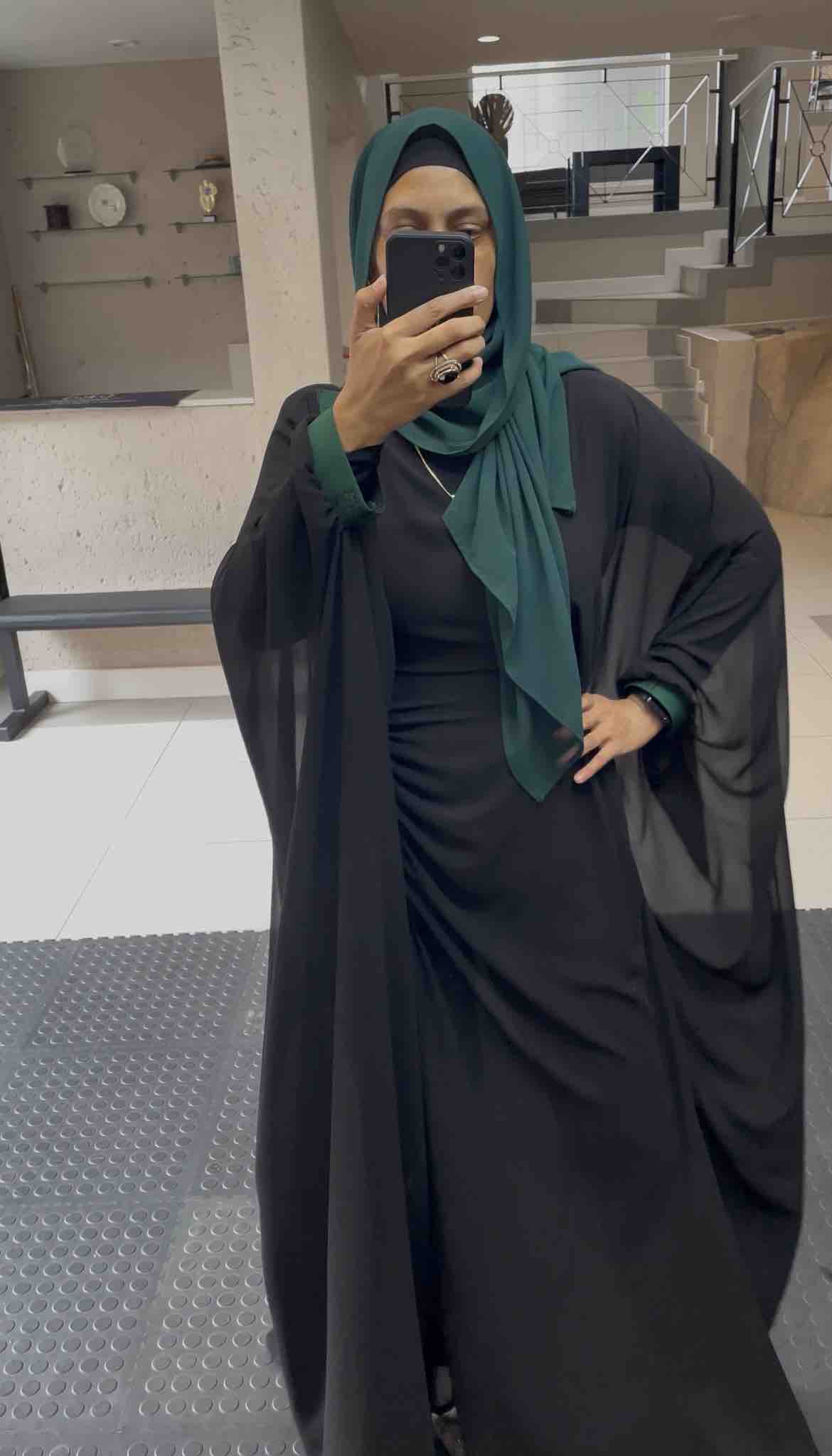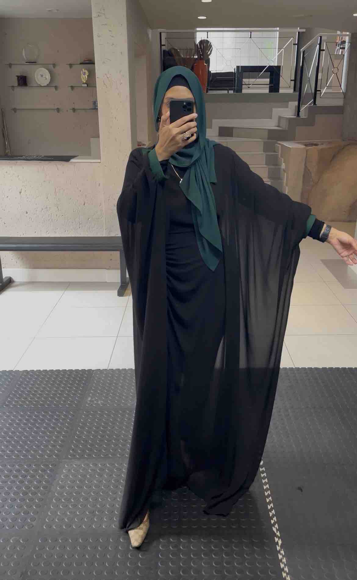 Flowing black abaya crafted with soft draped layers and loewe tape embellishment, designed for effortless elegance and graceful movement. A timeless statement piece combining modest sophistication with modern luxury — perfect for Eid occasions, evening wear, and refined everyday styling.